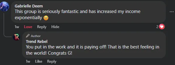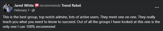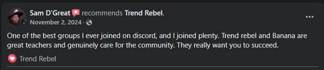 "For all of you on the fence about joining like I was and new to trading like I am, do your self a huge favor and give TR a try for at least 2-3 months. It may or may not take you this long watch all the videos they provide, to learn the lingo and understand the conversations in discord. It will pay for itself in your first couple of trades. And no it's not a scam it's the farthest thing from it, they will take the time to answer all of your questions to help you learn. TR is The Real FKing deal ppl." - Terry